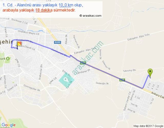 1. Cd. - Alanönü arası yaklaşık olarak 90 km/h ile yukarıda belirtilen sürede olup, iki yerin kuş uçuşu uzaklığı (mesafesi) 8'dir. Yolculuk otobüsle 23 dakika sürmektedir.