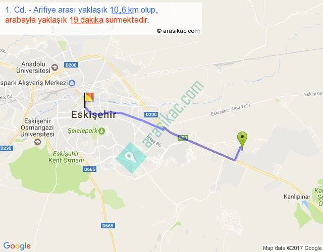 1. Cd. - Arifiye arası yaklaşık olarak 90 km/h ile yukarıda belirtilen sürede olup, iki yerin kuş uçuşu uzaklığı (mesafesi) 9'dir. Yolculuk otobüsle 24 dakika sürmektedir.