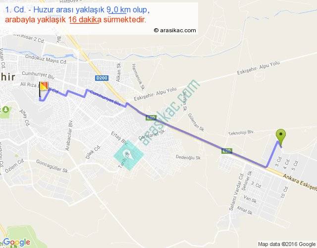 1. Cd. - Huzur arası yaklaşık olarak 90 km/h ile yukarıda belirtilen sürede olup, iki yerin kuş uçuşu uzaklığı (mesafesi) 7'dir. Yolculuk otobüsle 20 dakika sürmektedir.