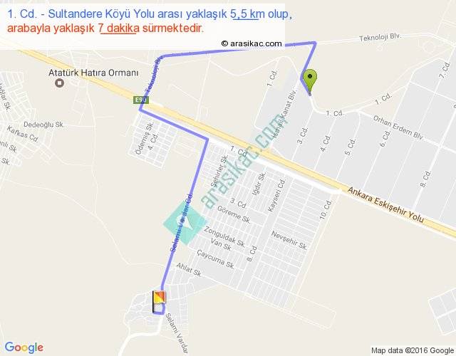 1. Cd. - Sultandere Köyü Yolu arası yaklaşık olarak 90 km/h ile yukarıda belirtilen sürede olup, iki yerin kuş uçuşu uzaklığı (mesafesi) 3'dir. Yolculuk otobüsle 9 dakika sürmektedir.