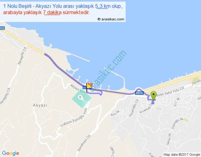 1 Nolu Beşirli - Akyazı Yolu arası yaklaşık olarak 90 km/h ile yukarıda belirtilen sürede olup, iki yerin kuş uçuşu uzaklığı (mesafesi) 2'dir. Yolculuk otobüsle 9 dakika sürmektedir.