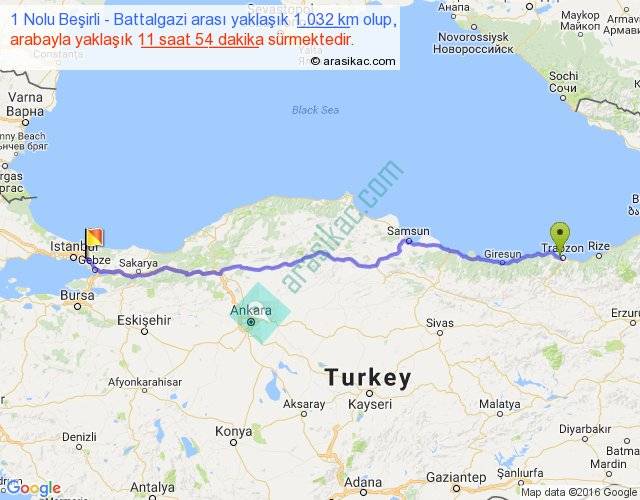 1 Nolu Beşirli - Battalgazi arası yaklaşık olarak 90 km/h ile yukarıda belirtilen sürede olup, iki yerin kuş uçuşu uzaklığı (mesafesi) 867'dir. Eğer belirtilen yerler arasında uçak seferi var ise bu süre uçakla 1 saat 20 dakika'ya kadar düşebilir. Yolculuk otobüsle 15 saat 28 dakika sürmektedir.