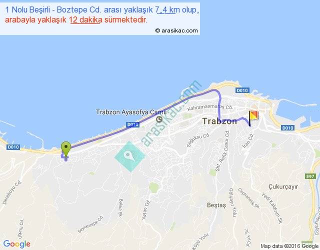 1 Nolu Beşirli - Boztepe Cd. arası yaklaşık olarak 90 km/h ile yukarıda belirtilen sürede olup, iki yerin kuş uçuşu uzaklığı (mesafesi) 5'dir. Yolculuk otobüsle 15 dakika sürmektedir.