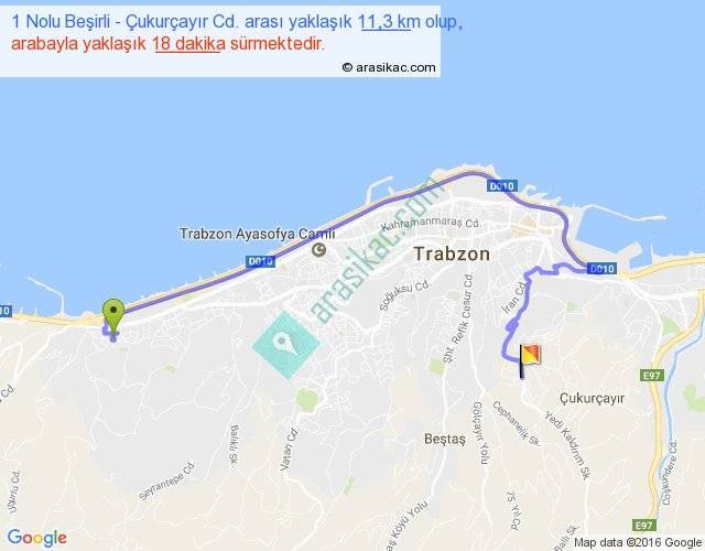 1 Nolu Beşirli - Çukurçayır Cd. arası yaklaşık olarak 90 km/h ile yukarıda belirtilen sürede olup, iki yerin kuş uçuşu uzaklığı (mesafesi) 5'dir. Yolculuk otobüsle 23 dakika sürmektedir.