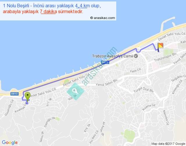 1 Nolu Beşirli - İnönü arası yaklaşık olarak 90 km/h ile yukarıda belirtilen sürede olup, iki yerin kuş uçuşu uzaklığı (mesafesi) 3'dir. Yolculuk otobüsle 9 dakika sürmektedir.
