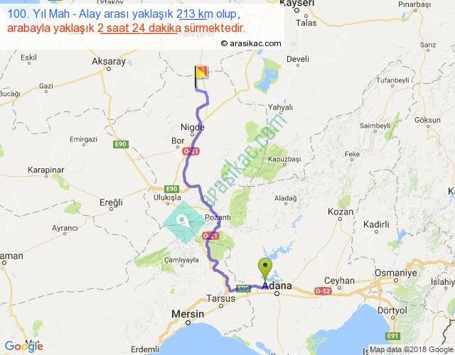 100. Yıl Mah - Alay arası yaklaşık olarak 90 km/h ile yukarıda belirtilen sürede olup, iki yerin kuş uçuşu uzaklığı (mesafesi) 141'dir. Yolculuk otobüsle 3 saat 7 dakika sürmektedir.