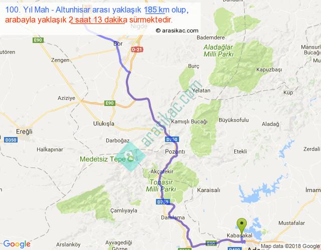 100. Yıl Mah - Altunhisar arası yaklaşık olarak 90 km/h ile yukarıda belirtilen sürede olup, iki yerin kuş uçuşu uzaklığı (mesafesi) 129'dir. Yolculuk otobüsle 2 saat 52 dakika sürmektedir.