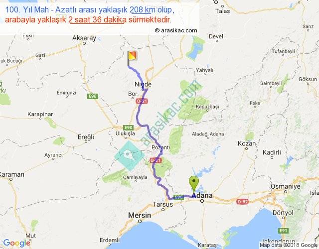 100. Yıl Mah - Azatlı arası yaklaşık olarak 90 km/h ile yukarıda belirtilen sürede olup, iki yerin kuş uçuşu uzaklığı (mesafesi) 138'dir. Yolculuk otobüsle 3 saat 22 dakika sürmektedir.
