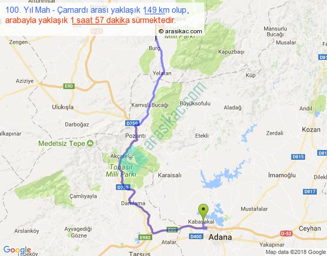 100. Yıl Mah - Çamardı arası yaklaşık olarak 90 km/h ile yukarıda belirtilen sürede olup, iki yerin kuş uçuşu uzaklığı (mesafesi) 89'dir. Yolculuk otobüsle 2 saat 32 dakika sürmektedir.