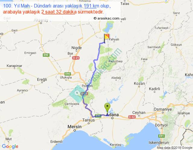 100. Yıl Mah - Dündarlı arası yaklaşık olarak 90 km/h ile yukarıda belirtilen sürede olup, iki yerin kuş uçuşu uzaklığı (mesafesi) 114'dir. Yolculuk otobüsle 3 saat 17 dakika sürmektedir.