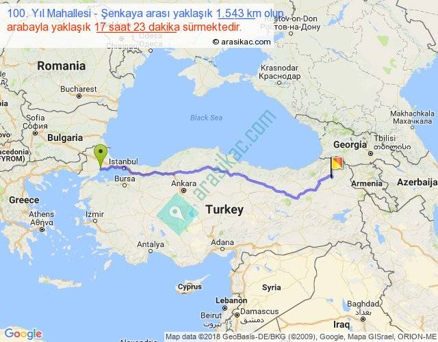 100. Yıl Mahallesi - Şenkaya arası yaklaşık olarak 90 km/h ile yukarıda belirtilen sürede olup, iki yerin kuş uçuşu uzaklığı (mesafesi) 1242'dir. Eğer belirtilen yerler arasında uçak seferi var ise bu süre uçakla 1 saat 54 dakika'ya kadar düşebilir. Yolculuk otobüsle 22 saat 35 dakika sürmektedir.