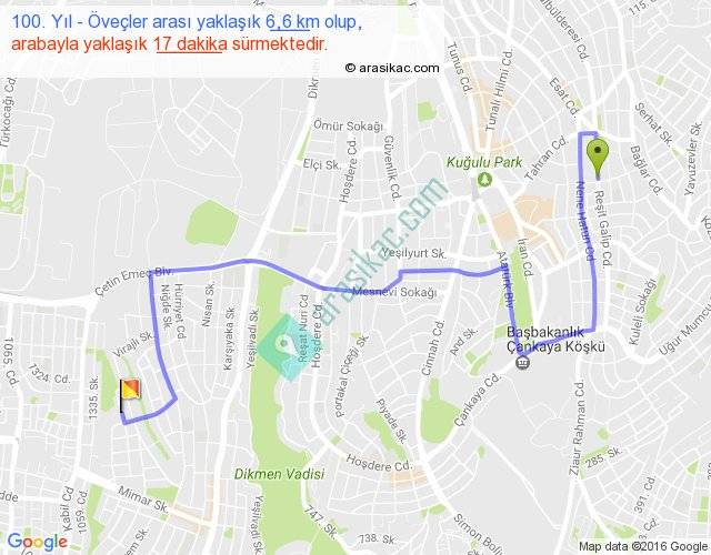 100. Yıl - Öveçler arası yaklaşık olarak 90 km/h ile yukarıda belirtilen sürede olup, iki yerin kuş uçuşu uzaklığı (mesafesi) 3'dir. Yolculuk otobüsle 22 dakika sürmektedir.