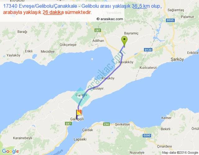 17340 Evreşe Gelibolu Çanakkale - Gelibolu arası yaklaşık olarak 90 km/h ile yukarıda belirtilen sürede olup, iki yerin kuş uçuşu uzaklığı (mesafesi) 32'dir. Yolculuk otobüsle 33 dakika sürmektedir.