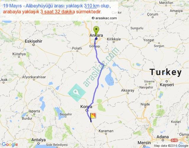 19 Mayıs - Alibeyhüyüğü arası yaklaşık olarak 90 km/h ile yukarıda belirtilen sürede olup, iki yerin kuş uçuşu uzaklığı (mesafesi) 272'dir. Eğer belirtilen yerler arasında uçak seferi var ise bu süre uçakla 25 dakika'ya kadar düşebilir. Yolculuk otobüsle 4 saat 35 dakika sürmektedir.