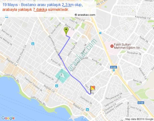 19 Mayıs - Bostancı arası yaklaşık olarak 90 km/h ile yukarıda belirtilen sürede olup, iki yerin kuş uçuşu uzaklığı (mesafesi) 2'dir. Yolculuk otobüsle 9 dakika sürmektedir.