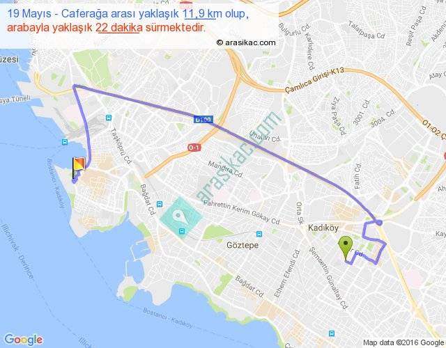 19 Mayıs - Caferağa arası yaklaşık olarak 90 km/h ile yukarıda belirtilen sürede olup, iki yerin kuş uçuşu uzaklığı (mesafesi) 6'dir. Yolculuk otobüsle 28 dakika sürmektedir.
