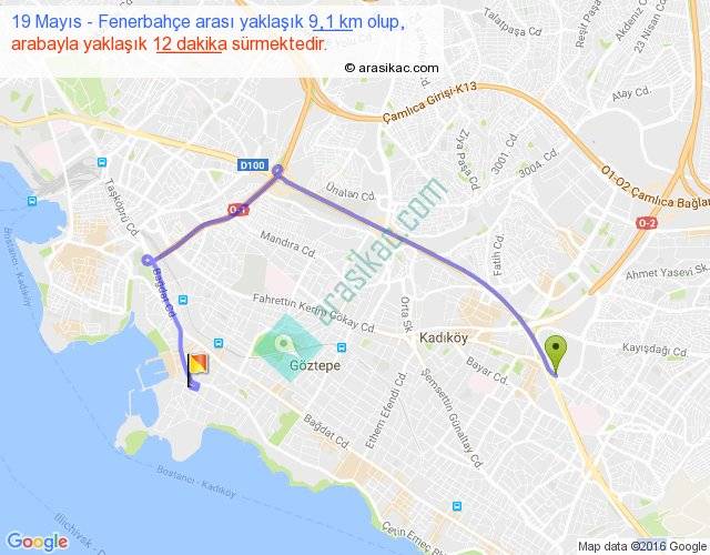 19 Mayıs - Fenerbahçe arası yaklaşık olarak 90 km/h ile yukarıda belirtilen sürede olup, iki yerin kuş uçuşu uzaklığı (mesafesi) 5'dir. Yolculuk otobüsle 15 dakika sürmektedir.