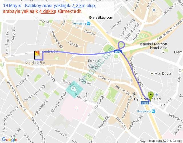 19 Mayıs - Kadiköy arası yaklaşık olarak 90 km/h ile yukarıda belirtilen sürede olup, iki yerin kuş uçuşu uzaklığı (mesafesi) 2'dir. Yolculuk otobüsle 5 dakika sürmektedir.