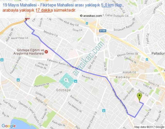 19 Mayıs Mahallesi - Fikirtepe Mahallesi arası yaklaşık olarak 90 km/h ile yukarıda belirtilen sürede olup, iki yerin kuş uçuşu uzaklığı (mesafesi) 4'dir. Yolculuk otobüsle 22 dakika sürmektedir.