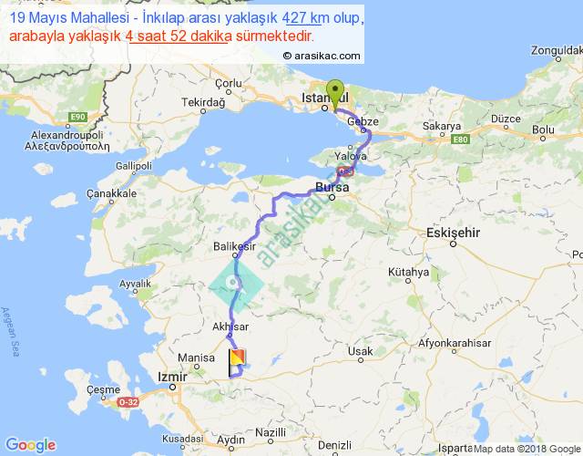 19 Mayıs Mahallesi - İnkılap arası yaklaşık olarak 90 km/h ile yukarıda belirtilen sürede olup, iki yerin kuş uçuşu uzaklığı (mesafesi) 292'dir. Eğer belirtilen yerler arasında uçak seferi var ise bu süre uçakla 26 dakika'ya kadar düşebilir. Yolculuk otobüsle 6 saat 19 dakika sürmektedir.