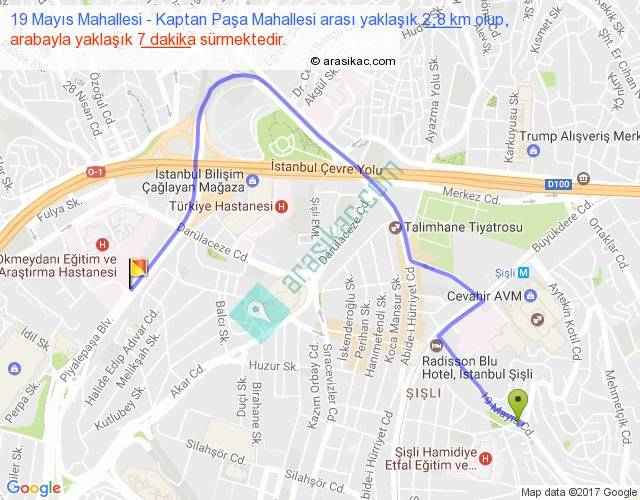 19 Mayıs Mahallesi - Kaptan Paşa Mahallesi arası yaklaşık olarak 90 km/h ile yukarıda belirtilen sürede olup, iki yerin kuş uçuşu uzaklığı (mesafesi) 1'dir. Yolculuk otobüsle 9 dakika sürmektedir.