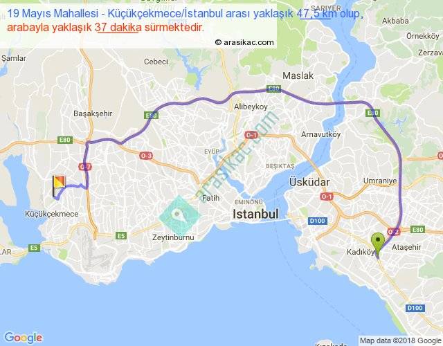 19 Mayıs Mahallesi - Küçükçekmece İstanbul arası yaklaşık olarak 90 km/h ile yukarıda belirtilen sürede olup, iki yerin kuş uçuşu uzaklığı (mesafesi) 27'dir. Yolculuk otobüsle 48 dakika sürmektedir.