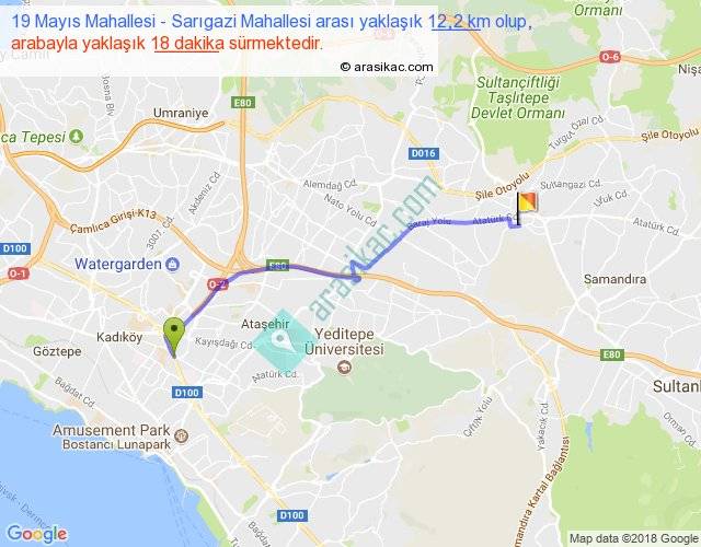 19 Mayıs Mahallesi - Sarıgazi Mahallesi arası yaklaşık olarak 90 km/h ile yukarıda belirtilen sürede olup, iki yerin kuş uçuşu uzaklığı (mesafesi) 10'dir. Yolculuk otobüsle 23 dakika sürmektedir.