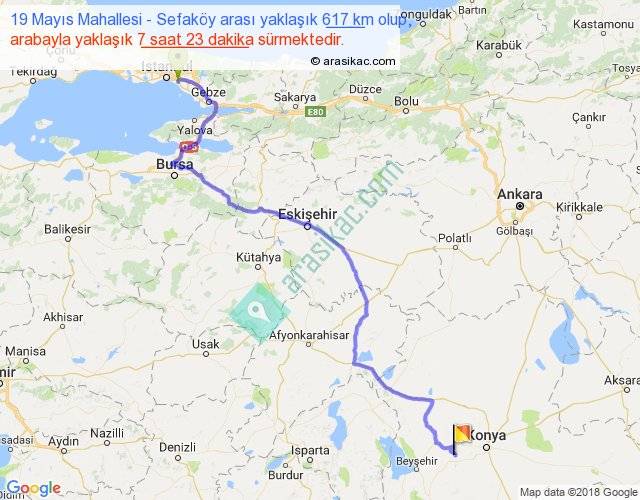 19 Mayıs Mahallesi - Sefaköy arası yaklaşık olarak 90 km/h ile yukarıda belirtilen sürede olup, iki yerin kuş uçuşu uzaklığı (mesafesi) 437'dir. Eğer belirtilen yerler arasında uçak seferi var ise bu süre uçakla 40 dakika'ya kadar düşebilir. Yolculuk otobüsle 9 saat 35 dakika sürmektedir.