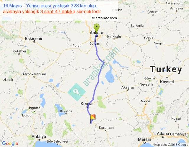19 Mayıs - Yenisu arası yaklaşık olarak 90 km/h ile yukarıda belirtilen sürede olup, iki yerin kuş uçuşu uzaklığı (mesafesi) 288'dir. Eğer belirtilen yerler arasında uçak seferi var ise bu süre uçakla 26 dakika'ya kadar düşebilir. Yolculuk otobüsle 4 saat 55 dakika sürmektedir.