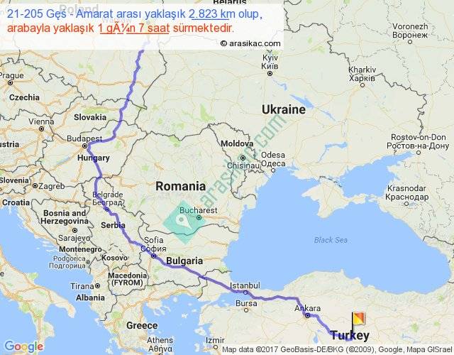 21-205 Gęś - Amarat arası yaklaşık olarak 90 km/h ile yukarıda belirtilen sürede olup, iki yerin kuş uçuşu uzaklığı (mesafesi) 1705'dir. Eğer belirtilen yerler arasında uçak seferi var ise bu süre uçakla 2 saat 37 dakika'ya kadar düşebilir. Yolculuk otobüsle 1 gün 16 saat sürmektedir.