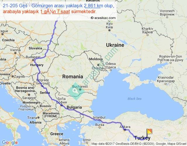 21-205 Gęś - Gömürgen arası yaklaşık olarak 90 km/h ile yukarıda belirtilen sürede olup, iki yerin kuş uçuşu uzaklığı (mesafesi) 1731'dir. Eğer belirtilen yerler arasında uçak seferi var ise bu süre uçakla 2 saat 39 dakika'ya kadar düşebilir. Yolculuk otobüsle 1 gün 16 saat sürmektedir.