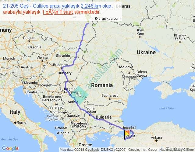 21-205 Gęś - Güllüce arası yaklaşık olarak 90 km/h ile yukarıda belirtilen sürede olup, iki yerin kuş uçuşu uzaklığı (mesafesi) 1353'dir. Eğer belirtilen yerler arasında uçak seferi var ise bu süre uçakla 2 saat 04 dakika'ya kadar düşebilir. Yolculuk otobüsle 1 gün 8 saat sürmektedir.