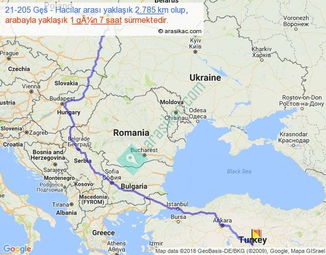 21-205 Gęś - Hacılar arası yaklaşık olarak 90 km/h ile yukarıda belirtilen sürede olup, iki yerin kuş uçuşu uzaklığı (mesafesi) 1734'dir. Eğer belirtilen yerler arasında uçak seferi var ise bu süre uçakla 2 saat 40 dakika'ya kadar düşebilir. Yolculuk otobüsle 1 gün 16 saat sürmektedir.