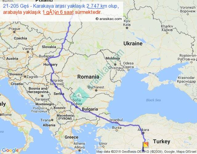 21-205 Gęś - Karakaya arası yaklaşık olarak 90 km/h ile yukarıda belirtilen sürede olup, iki yerin kuş uçuşu uzaklığı (mesafesi) 1708'dir. Eğer belirtilen yerler arasında uçak seferi var ise bu süre uçakla 2 saat 37 dakika'ya kadar düşebilir. Yolculuk otobüsle 1 gün 15 saat sürmektedir.