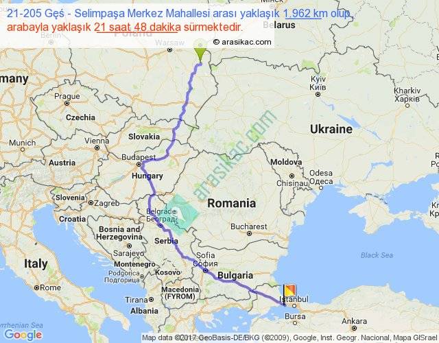 21-205 Gęś - Selimpaşa Merkez Mahallesi arası yaklaşık olarak 90 km/h ile yukarıda belirtilen sürede olup, iki yerin kuş uçuşu uzaklığı (mesafesi) 1246'dir. Eğer belirtilen yerler arasında uçak seferi var ise bu süre uçakla 1 saat 55 dakika'ya kadar düşebilir. Yolculuk otobüsle 1 gün 4 saat sürmektedir.