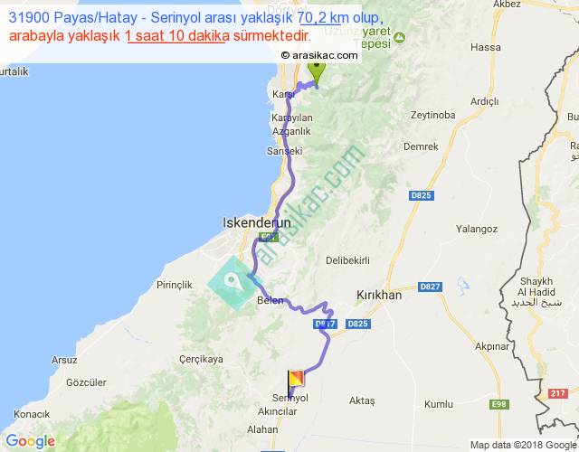 31900 Payas Hatay - Serinyol arası yaklaşık olarak 90 km/h ile yukarıda belirtilen sürede olup, iki yerin kuş uçuşu uzaklığı (mesafesi) 42'dir. Yolculuk otobüsle 1 saat 31 dakika sürmektedir.