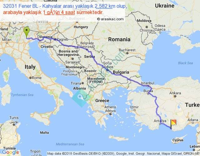 32031 Fener BL - Kahyalar arası yaklaşık olarak 90 km/h ile yukarıda belirtilen sürede olup, iki yerin kuş uçuşu uzaklığı (mesafesi) 1990'dir. Eğer belirtilen yerler arasında uçak seferi var ise bu süre uçakla 3 saat 03 dakika'ya kadar düşebilir. Yolculuk otobüsle 1 gün 12 saat sürmektedir.