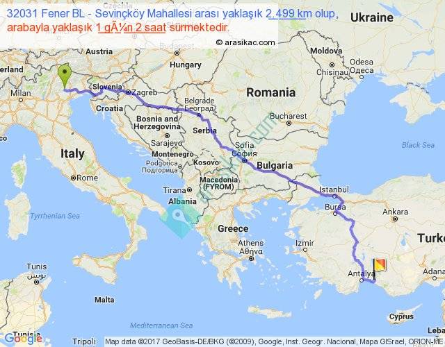 32031 Fener BL - Sevinçköy Mahallesi arası yaklaşık olarak 90 km/h ile yukarıda belirtilen sürede olup, iki yerin kuş uçuşu uzaklığı (mesafesi) 1897'dir. Eğer belirtilen yerler arasında uçak seferi var ise bu süre uçakla 2 saat 55 dakika'ya kadar düşebilir. Yolculuk otobüsle 1 gün 9 saat sürmektedir.