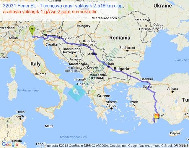 32031 Fener BL - Turunçova arası yaklaşık olarak 90 km/h ile yukarıda belirtilen sürede olup, iki yerin kuş uçuşu uzaklığı (mesafesi) 1839'dir. Eğer belirtilen yerler arasında uçak seferi var ise bu süre uçakla 2 saat 49 dakika'ya kadar düşebilir. Yolculuk otobüsle 1 gün 9 saat sürmektedir.