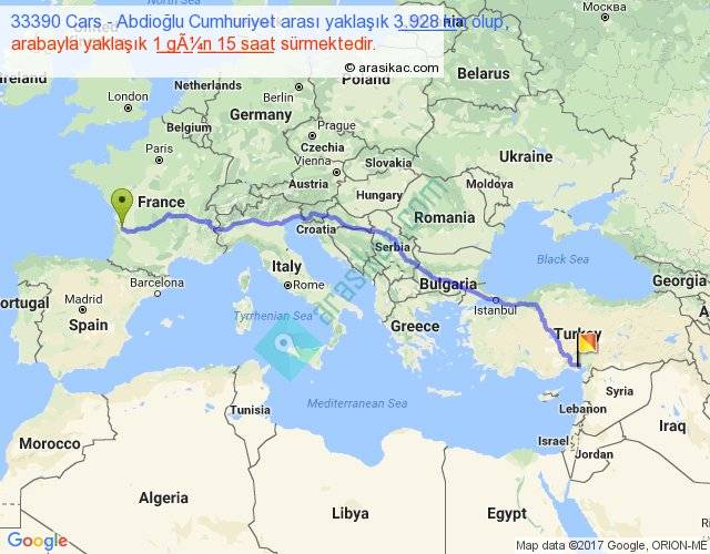 33390 Cars - Abdioğlu Cumhuriyet arası yaklaşık olarak 90 km/h ile yukarıda belirtilen sürede olup, iki yerin kuş uçuşu uzaklığı (mesafesi) 3123'dir. Eğer belirtilen yerler arasında uçak seferi var ise bu süre uçakla 4 saat 48 dakika'ya kadar düşebilir. Yolculuk otobüsle 2 gün 2 saat sürmektedir.