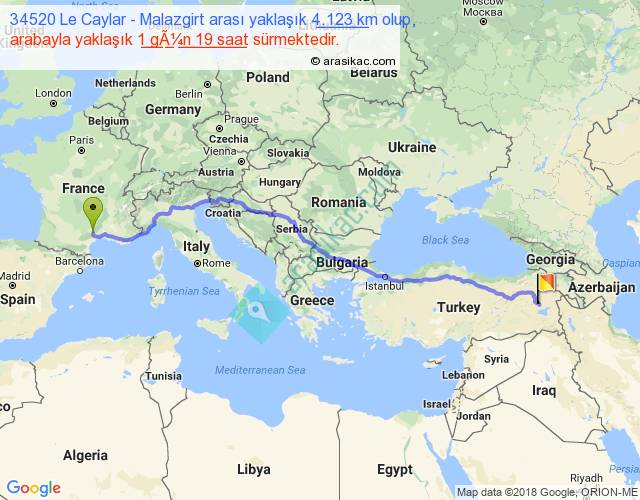 34520 Le Caylar - Malazgirt arası yaklaşık olarak 90 km/h ile yukarıda belirtilen sürede olup, iki yerin kuş uçuşu uzaklığı (mesafesi) 3257'dir. Eğer belirtilen yerler arasında uçak seferi var ise bu süre uçakla 5 saat 00 dakika'ya kadar düşebilir. Yolculuk otobüsle 2 gün 7 saat sürmektedir.