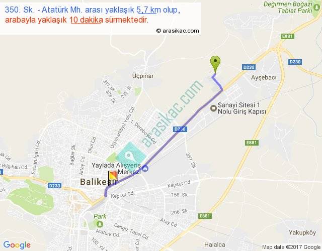 350. Sk. - Atatürk Mh. arası yaklaşık olarak 90 km/h ile yukarıda belirtilen sürede olup, iki yerin kuş uçuşu uzaklığı (mesafesi) 4'dir. Yolculuk otobüsle 13 dakika sürmektedir.