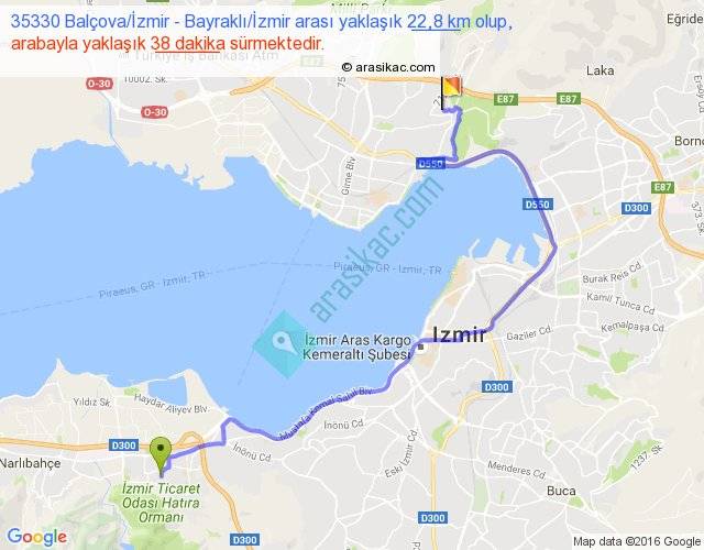 35330 Balçova İzmir - Bayraklı İzmir arası yaklaşık olarak 90 km/h ile yukarıda belirtilen sürede olup, iki yerin kuş uçuşu uzaklığı (mesafesi) 12'dir. Yolculuk otobüsle 49 dakika sürmektedir.