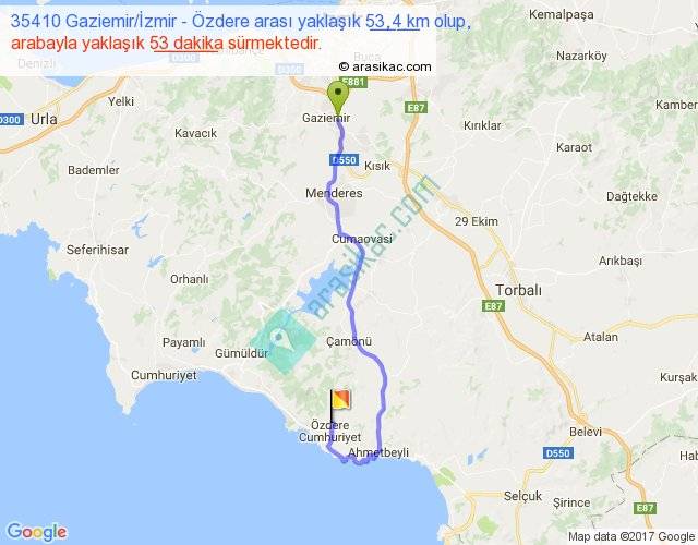 35410 Gaziemir İzmir - Özdere arası yaklaşık olarak 90 km/h ile yukarıda belirtilen sürede olup, iki yerin kuş uçuşu uzaklığı (mesafesi) 33'dir. Yolculuk otobüsle 1 saat 8 dakika sürmektedir.