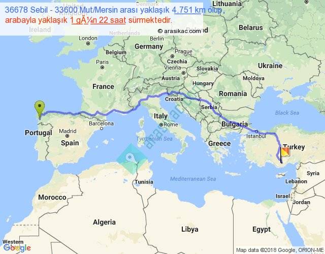 36678 Sebil - 33600 Mut Mersin arası yaklaşık olarak 90 km/h ile yukarıda belirtilen sürede olup, iki yerin kuş uçuşu uzaklığı (mesafesi) 3582'dir. Eğer belirtilen yerler arasında uçak seferi var ise bu süre uçakla 5 saat 30 dakika'ya kadar düşebilir. Yolculuk otobüsle 2 gün 11 saat sürmektedir.