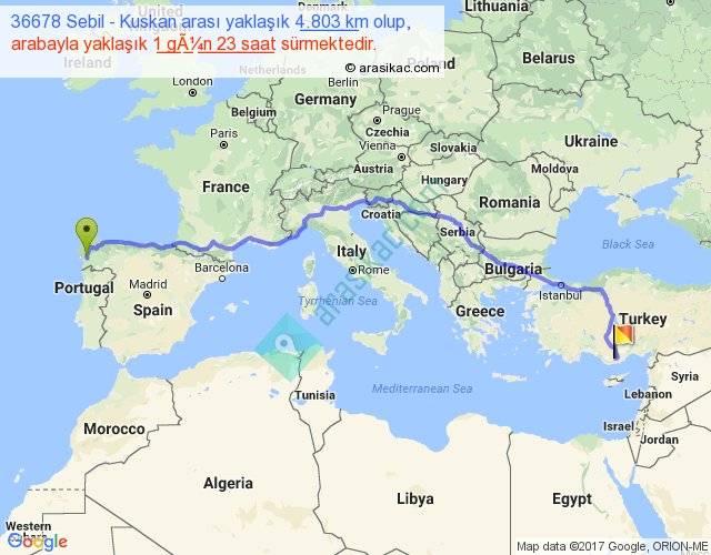 36678 Sebil - Kuskan arası yaklaşık olarak 90 km/h ile yukarıda belirtilen sürede olup, iki yerin kuş uçuşu uzaklığı (mesafesi) 3589'dir. Eğer belirtilen yerler arasında uçak seferi var ise bu süre uçakla 5 saat 31 dakika'ya kadar düşebilir. Yolculuk otobüsle 2 gün 13 saat sürmektedir.