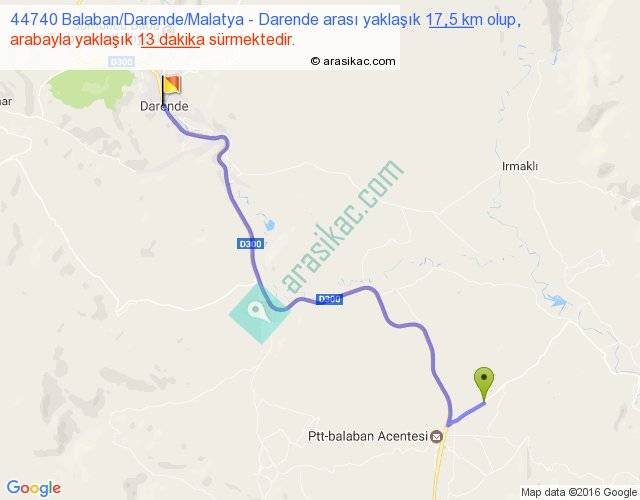44740 Balaban Darende Malatya - Darende arası yaklaşık olarak 90 km/h ile yukarıda belirtilen sürede olup, iki yerin kuş uçuşu uzaklığı (mesafesi) 13'dir. Yolculuk otobüsle 16 dakika sürmektedir.