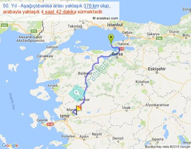 50. Yıl - Aşağıçobanisa arası yaklaşık olarak 90 km/h ile yukarıda belirtilen sürede olup, iki yerin kuş uçuşu uzaklığı (mesafesi) 244'dir. Yolculuk otobüsle 6 saat 6 dakika sürmektedir.