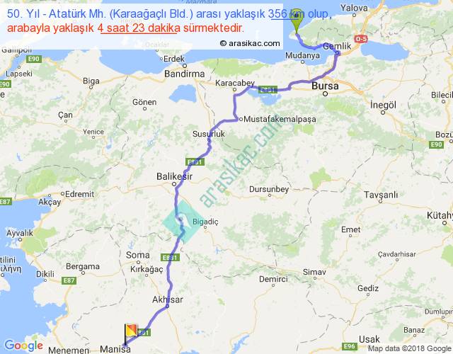 50. Yıl - Atatürk Mh. (Karaağaçlı Bld.) arası yaklaşık olarak 90 km/h ile yukarıda belirtilen sürede olup, iki yerin kuş uçuşu uzaklığı (mesafesi) 235'dir. Yolculuk otobüsle 5 saat 41 dakika sürmektedir.