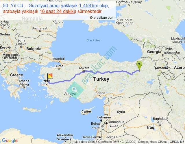 50. Yıl Cd. - Güzelyurt arası yaklaşık olarak 90 km/h ile yukarıda belirtilen sürede olup, iki yerin kuş uçuşu uzaklığı (mesafesi) 1196'dir. Eğer belirtilen yerler arasında uçak seferi var ise bu süre uçakla 1 saat 50 dakika'ya kadar düşebilir. Yolculuk otobüsle 21 saat 19 dakika sürmektedir.